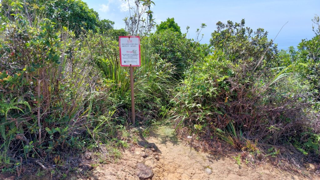 西灣亭起步,經吹筒坳過西灣山,下山不遠,左側立有一危險牌處,左轉小徑往睇魚岩頂。