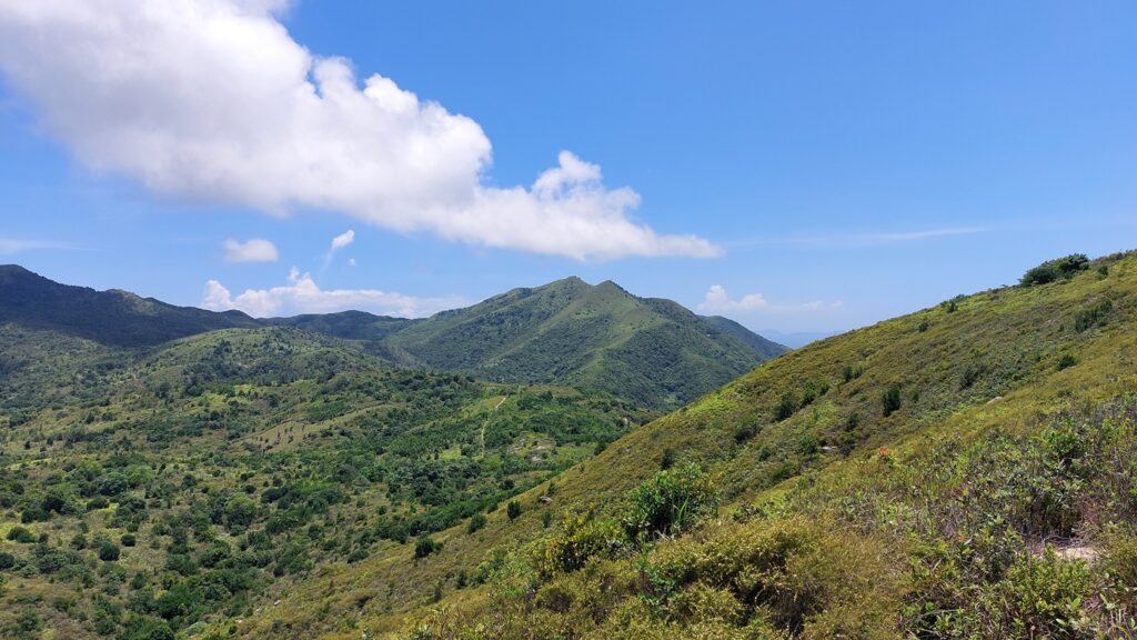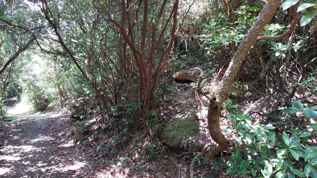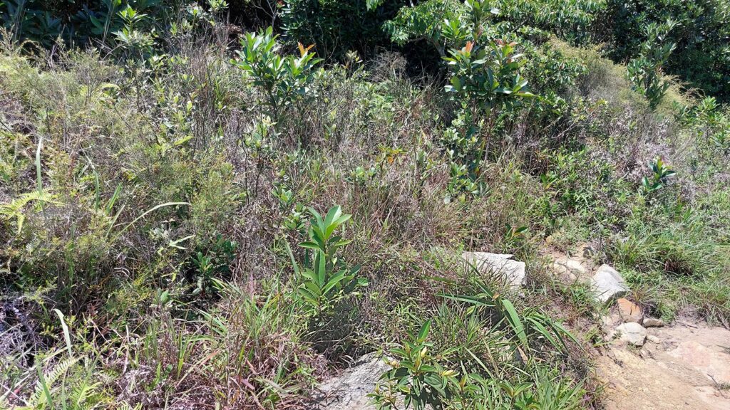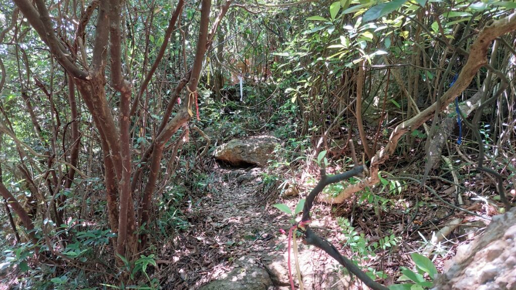 過L053不遠,留意右側有絲帶指示的小徑,沿小徑上攀尖峰山。上山路徑陡峭崎嶇,草叢茂密,有時需攀爬,個別位有些危險需小心。