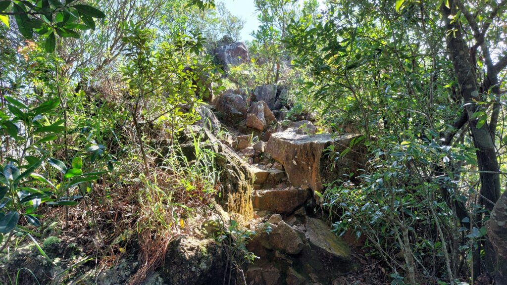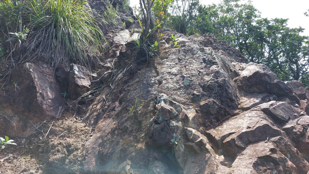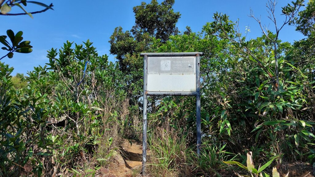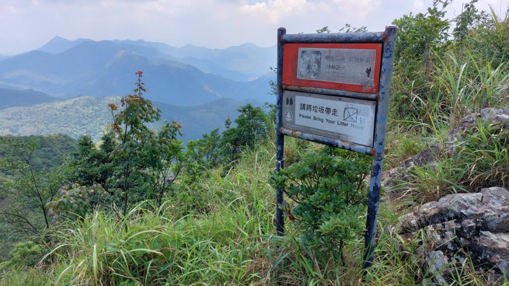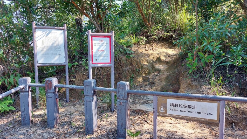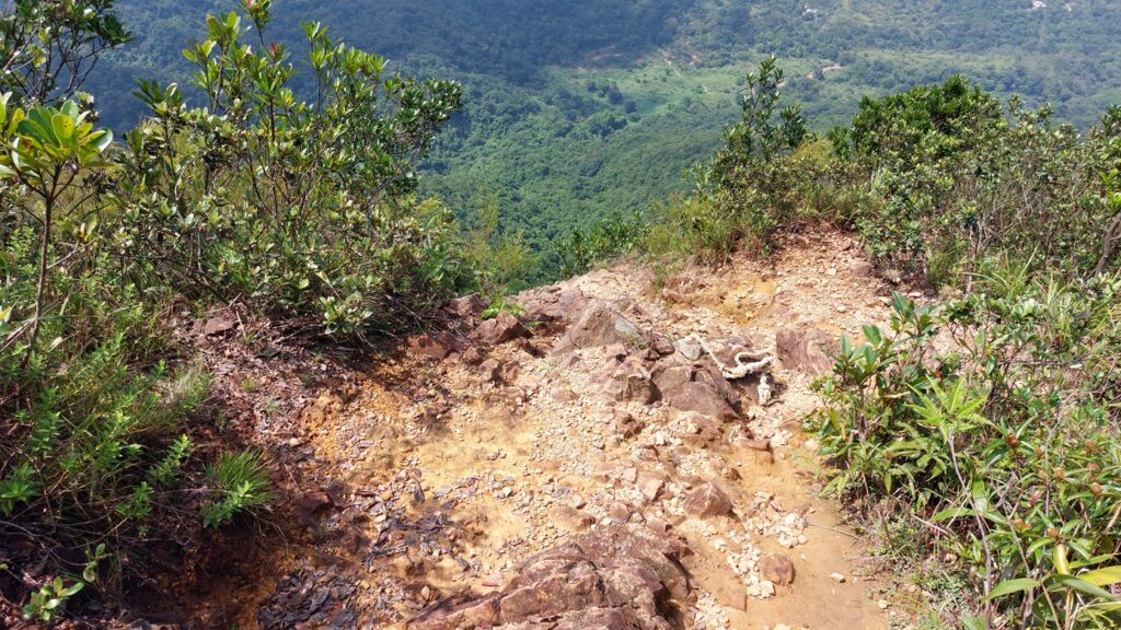 由此開始,沿山脊前行。路徑崎嶇險峭,多懸崖,需時刻留意安全。經第2個危險警告牌後,上攀路徑變得非常陡峭,不時需攀爬,至吊手岩頂。