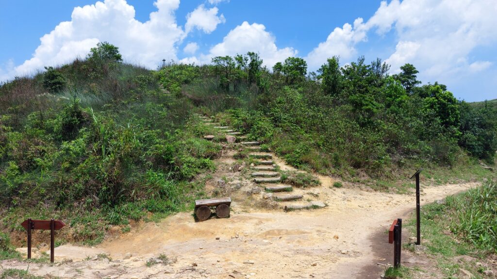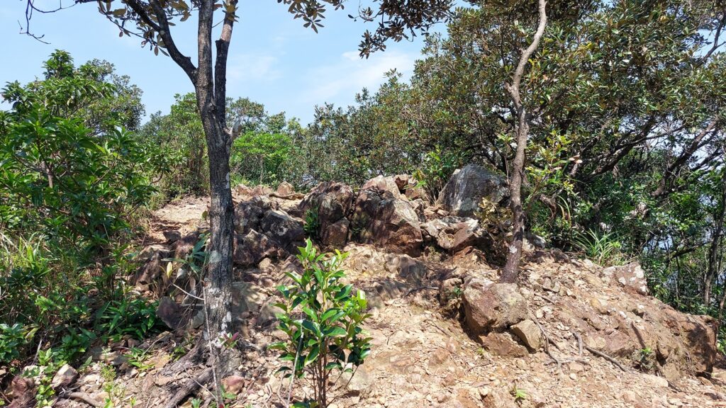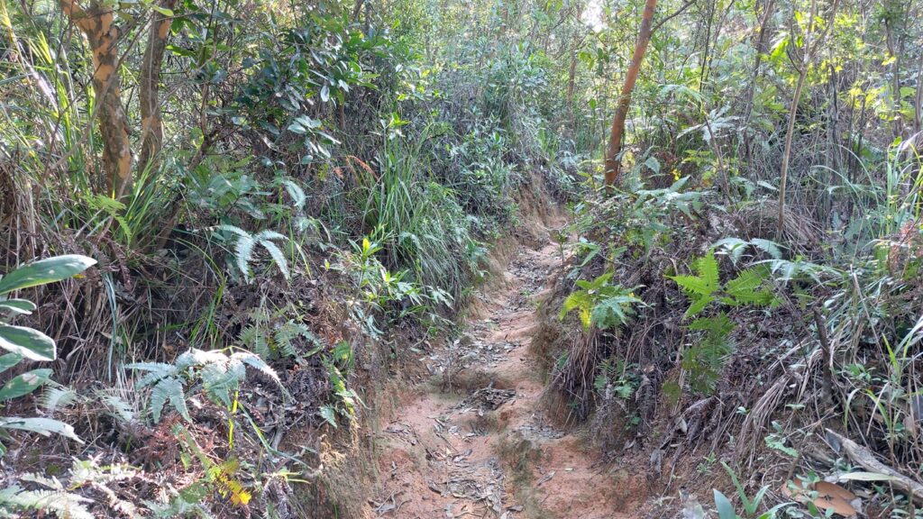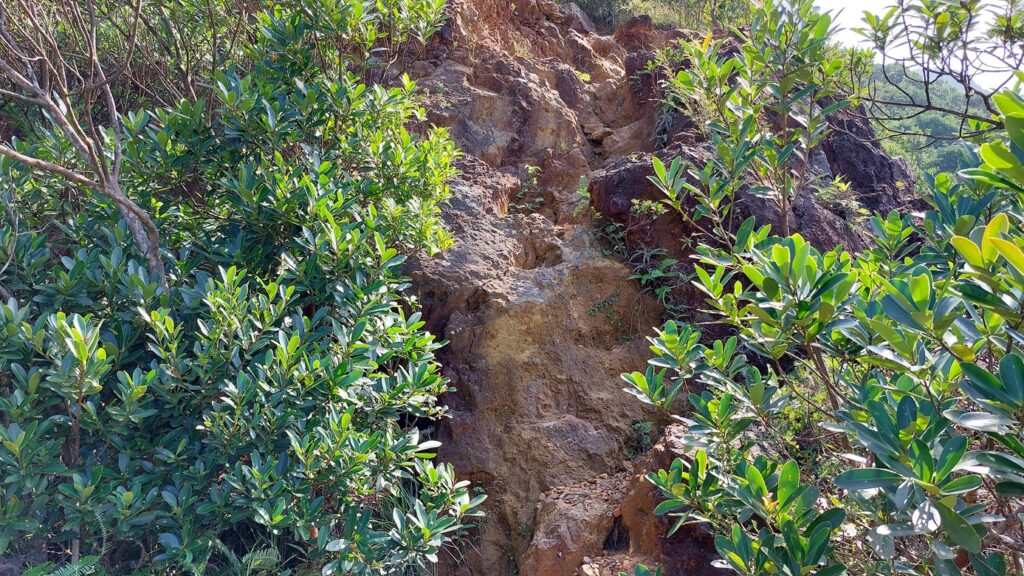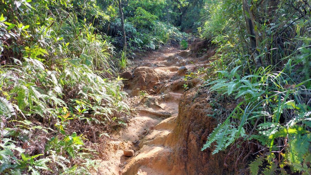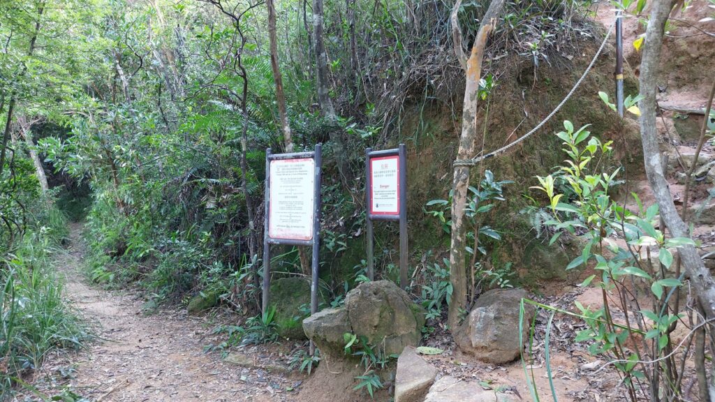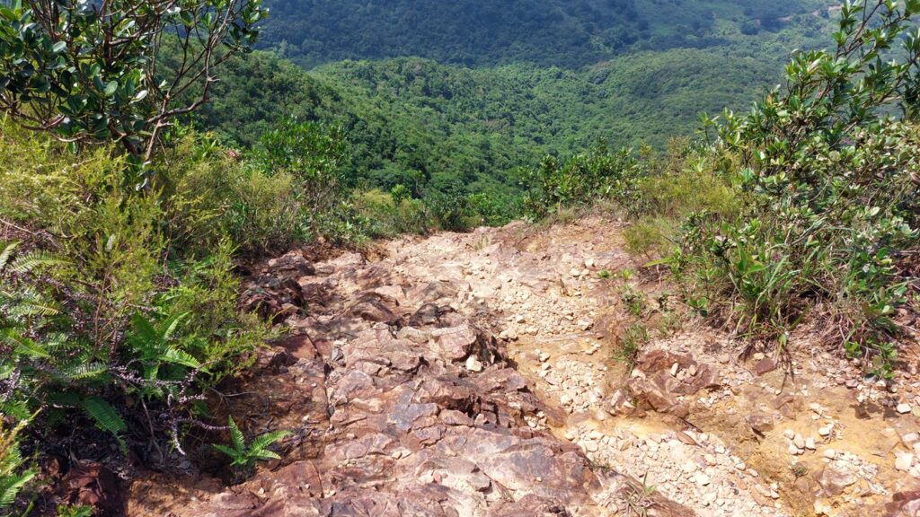 由此開始,沿山脊前行。路徑崎嶇險峭,多懸崖,需時刻留意安全。經第2個危險警告牌後,上攀路徑變得非常陡峭,不時需攀爬,至吊手岩頂。