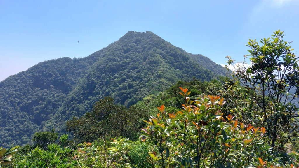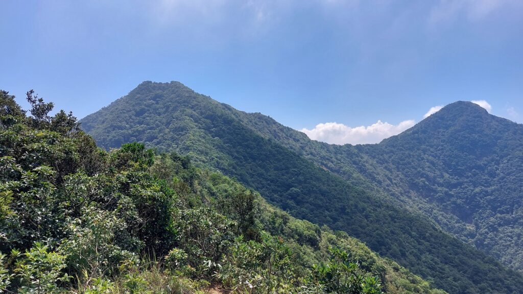 由吊手岩稍下落,再上走至牛押山頂。再下行一段後,上登最高峰馬鞍山頂,後沿東脊路徑下山至馬鞍坳。